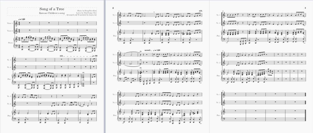To start my first inquiry, I had to do some research and ask around my musician friends of what I need to do before starting to arrange a pre-existing song into a choral arrangement. My old music teacher and now my colleague, Jaymi Daniels, told me the best place to start is to find a Vocal/Piano/Guitar score to set a foundation of the song, including tempo, key signature and core rhythms. I managed to find a score to reference, which was on a Korean blog, as I am using a Korean song. The key signature of the song is in C Major, so it is very easy for elementary students to learn and the song has many great educational factors for music elements. The song has an accidental (sharp), tempo change from slow to fast, various rhythmic notes and dynamics. To get started with the arrangement, I started from copying the piano part from the original score. However, I realized that it was going to be too difficult for a choir accompanist to play while students sing and to also help the singers out with their notes. To solve this issue, I changed them up to my liking. After each section, which has not been marked yet, I also wrote the melody line for Voice 1 part to go with the piano. Than I realized that it was going to be very boring and uninteresting for the Voice 2 students to strictly sing a harmony, so I moved some melody parts to the Voice 2 and added harmonies, wherever I saw fit or empty. My hope is that both voices are going to be singing some portion of melody and harmony, so students get a learning of all different parts, before they part more professionally in upper years into soprano, alto, tenor and bass. The version I have screenshotted and attached below is still incomplete with only the verse and beginning part of chorus done, but it is the beginning of the longer process of refining and editing, which comes after writing all the initial parts down! I will post the video of the product in later reflection blog.